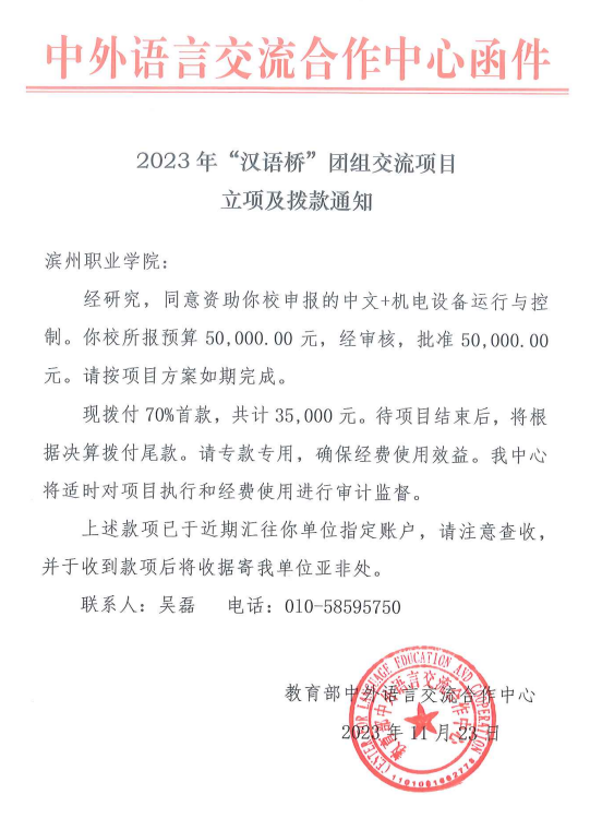 近日,接教育部中外语言交流合作中心通知,公司伟德国际victor1946王发鸿主持的中文+机电设备运行与控制“汉语桥”线上团组交流项目获准立项。